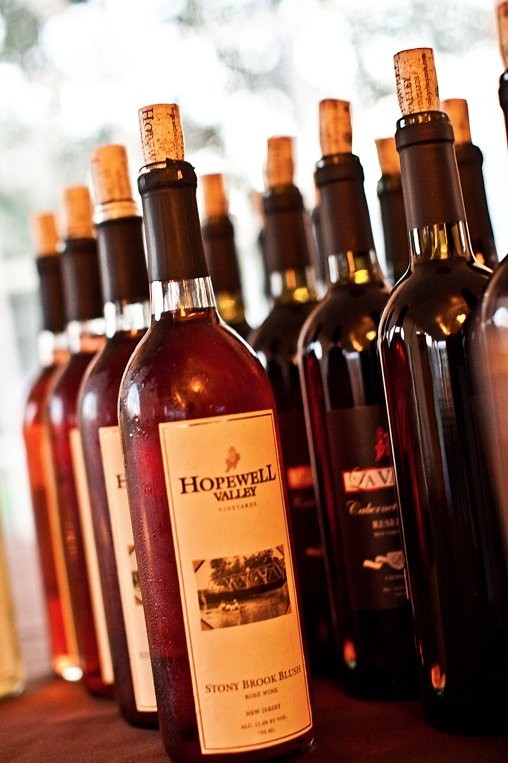 Stony Brook Blush in a lineup of open bottles at a wedding at Hopewell Valley Vineyards. Photography by Gary & Aneta Photgraphy.